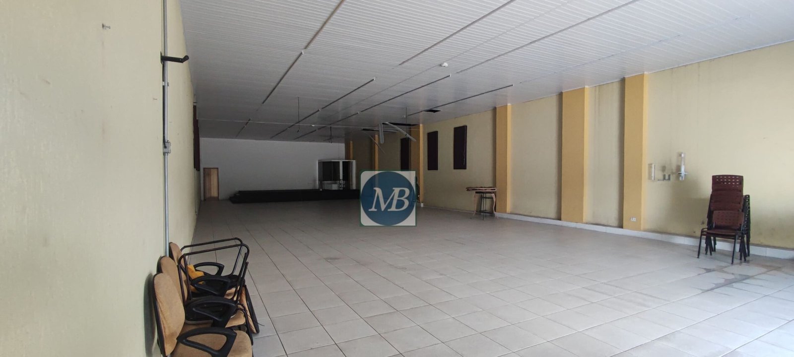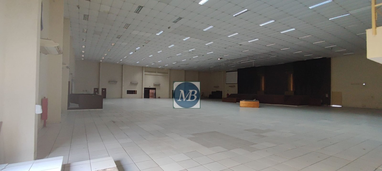 - Área fabril com pontos de ar-condicionado e tela de projeção instalada